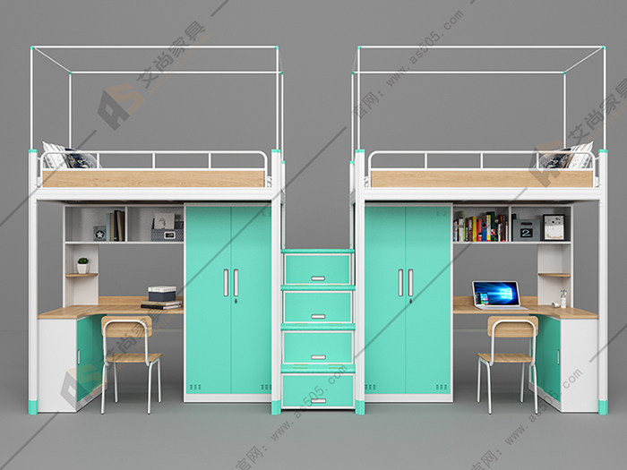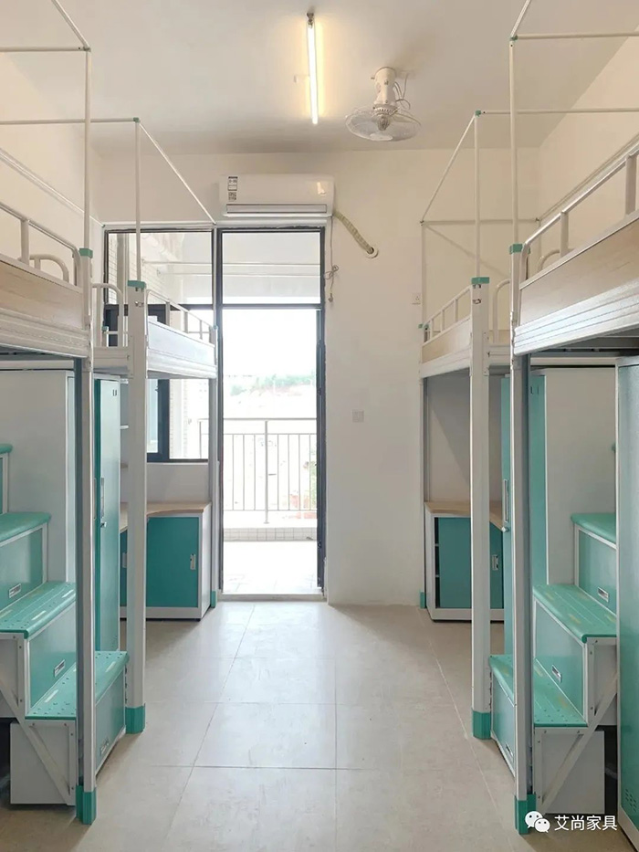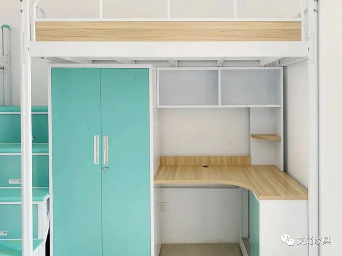 艾尚家具很榮幸為該校宿舍設(shè)計這款公寓床,顏色搭配上采用淺綠色和白色為主色調(diào),搭配點木紋色顯得格外溫馨,床梯是用儲物柜設(shè)計組成,極大的利用了空間以及增添設(shè)計感。同時也配有衣柜等收納配置,增加了學(xué)生的使用空間,以及私密空間。