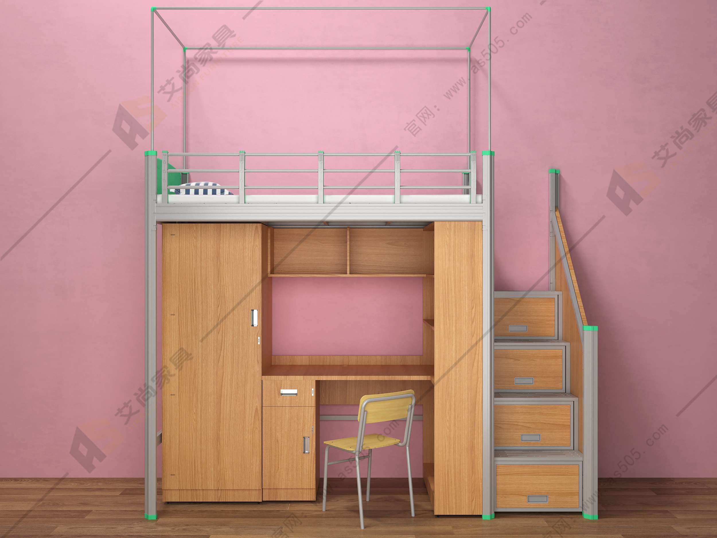 上方床下方桌帶衣柜的組合式公寓床,常見的就是單體、二連和三連這三種款式的,分別通常運用于4人間和6人間宿舍。這類學生宿舍公寓床的優(yōu)點在于儲物空間和學習空間較大,而且每個學生之間的隱私性相對更好,拉個簾子甚至幾個小空間互不干擾。也是目前高校選購的主流宿舍床。