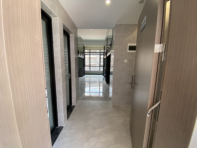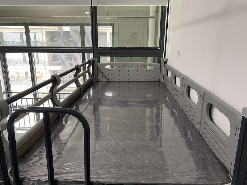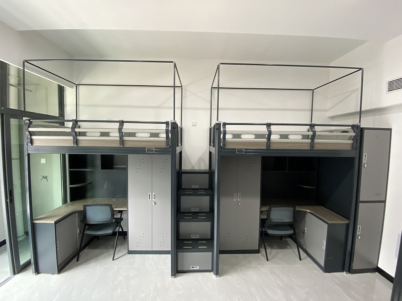 項目目前進展順利,一至三層樓正在進場安裝,宿舍房間明亮整潔,配置兩連體中梯公寓床,上有新款護欄加蚊帳桿,下有七字書桌配超大儲物柜,給員工創(chuàng)造獨立的私人空間。公寓床色調與宿舍裝修風格相協調,床體采用黑白灰設計,配色高雅,房間整體布局舒適溫馨。