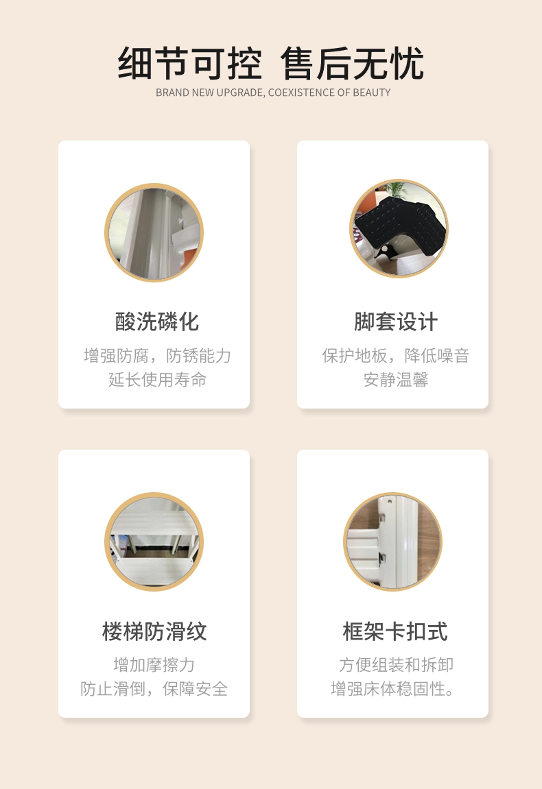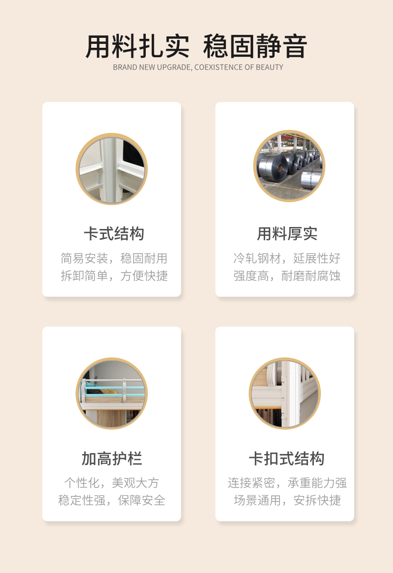 床架結(jié)構(gòu)穩(wěn)固不易變形,承重力好,床體承重力達(dá)500KG 根據(jù)人體工程學(xué)設(shè)計(jì),上下舒適自如!